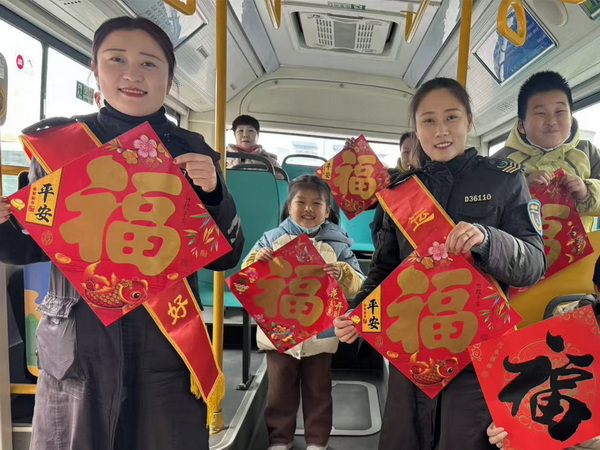 “没想到等车还能收到福字!”乘客陶先生接过这份惊喜,开心地说。车厢内,一串串春节主题拉花将车窗装点得红火温暖,冬日阳光透过车窗洒入,映得满厢红光熠熠、喜气洋洋。